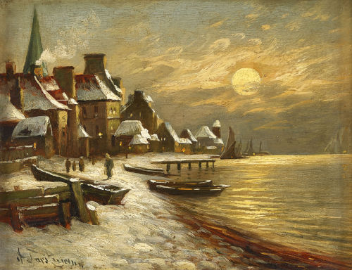 Verschneite Stadt am Ufer.