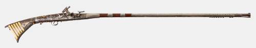 "Moukhala", Typ "Altit". Rundlauf, Kammerdrittel achtkantig, mit englischen Pseudo-Kontrollmarken (L: 121,7 cm), Kal. 14 mm. Über dem Kammerboden geschnittenes Visier und Korn. Schloss mit innenliegender Schlagfeder, Pfanne mit Schiebedeckel. Lange Laufhülse und drei Laufbänder aus Silberblech. Dunkler Holzschaft, im Kolbenbereich mit durchbrochen gearbeiteten, rankenartigen Silberblechen, belegt mit dekorativen Gravuren. Flacher Dreieckkolben, beidseitig mit je fünf silbergefassten Beinplatten. Kleiner halbrunder Abzugbügel aus Silber, dazu mobiler Anhänger. Eisenladestock.