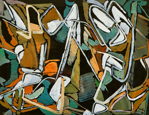 Composition en blanc, brun et vert sur fond noir.