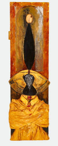 Collage, Mischtechnik mit Holz und Textil, verso Künstlerzeichen u. betitelt, 129,5x39 cm