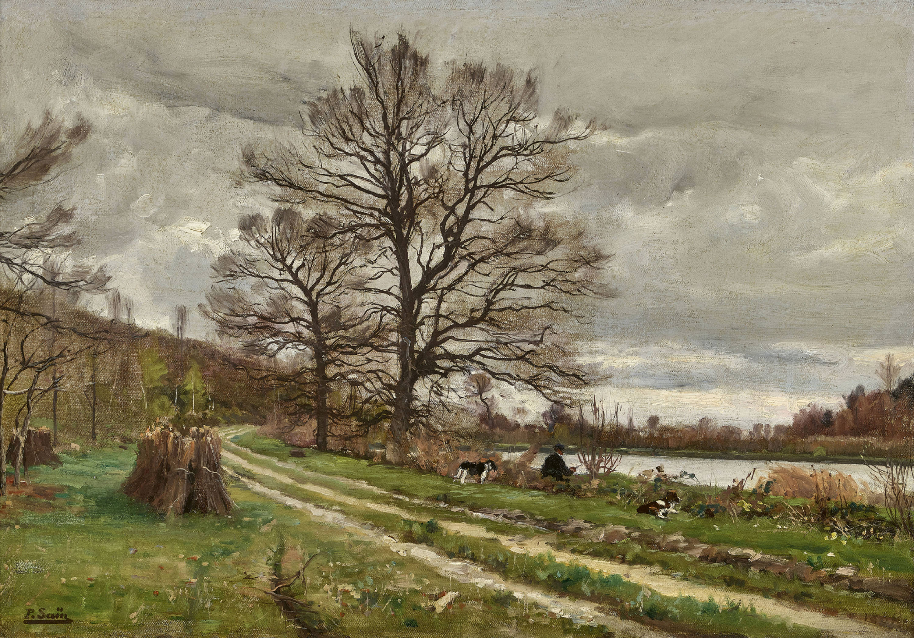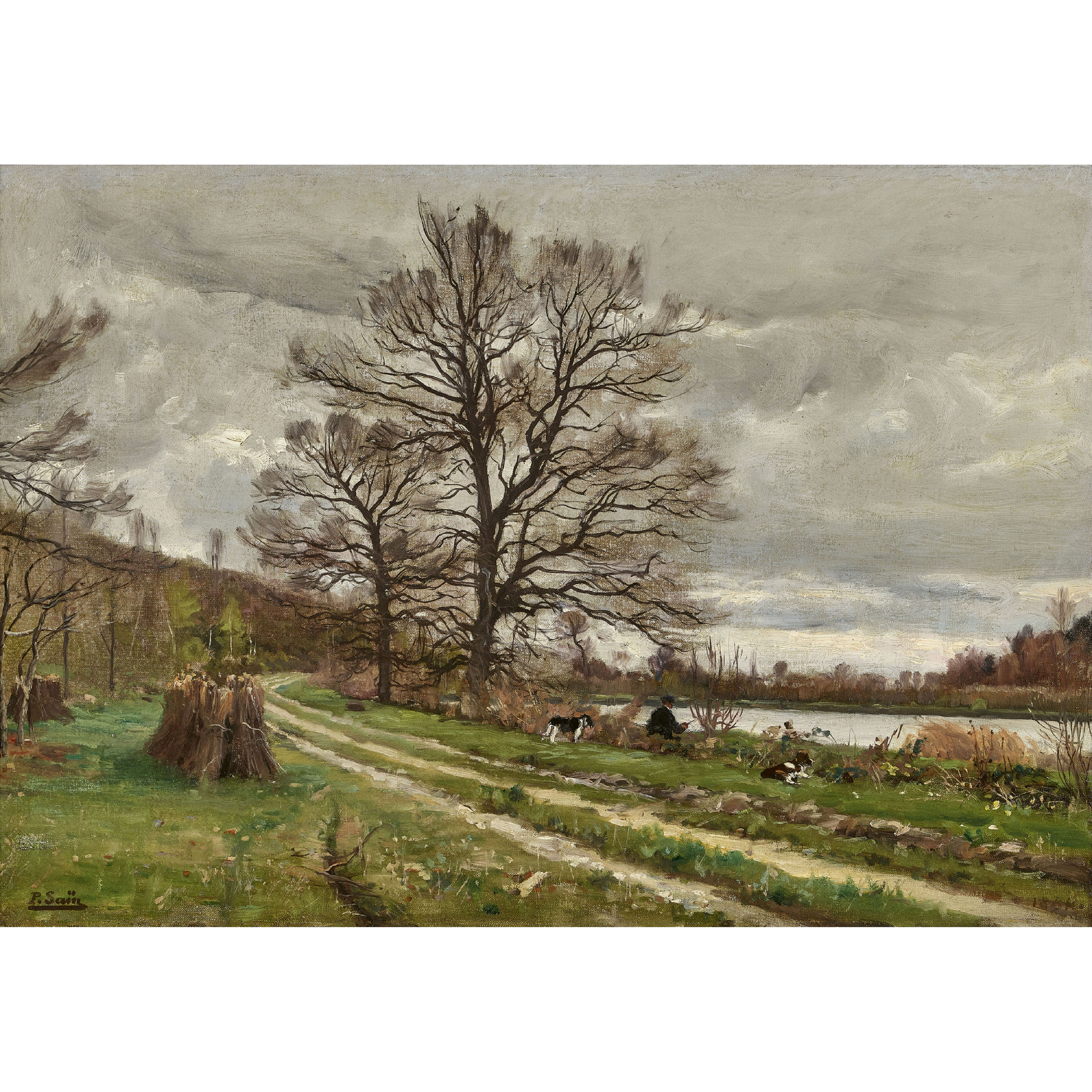 Flussufer mit Fischer und Hundepaar.
