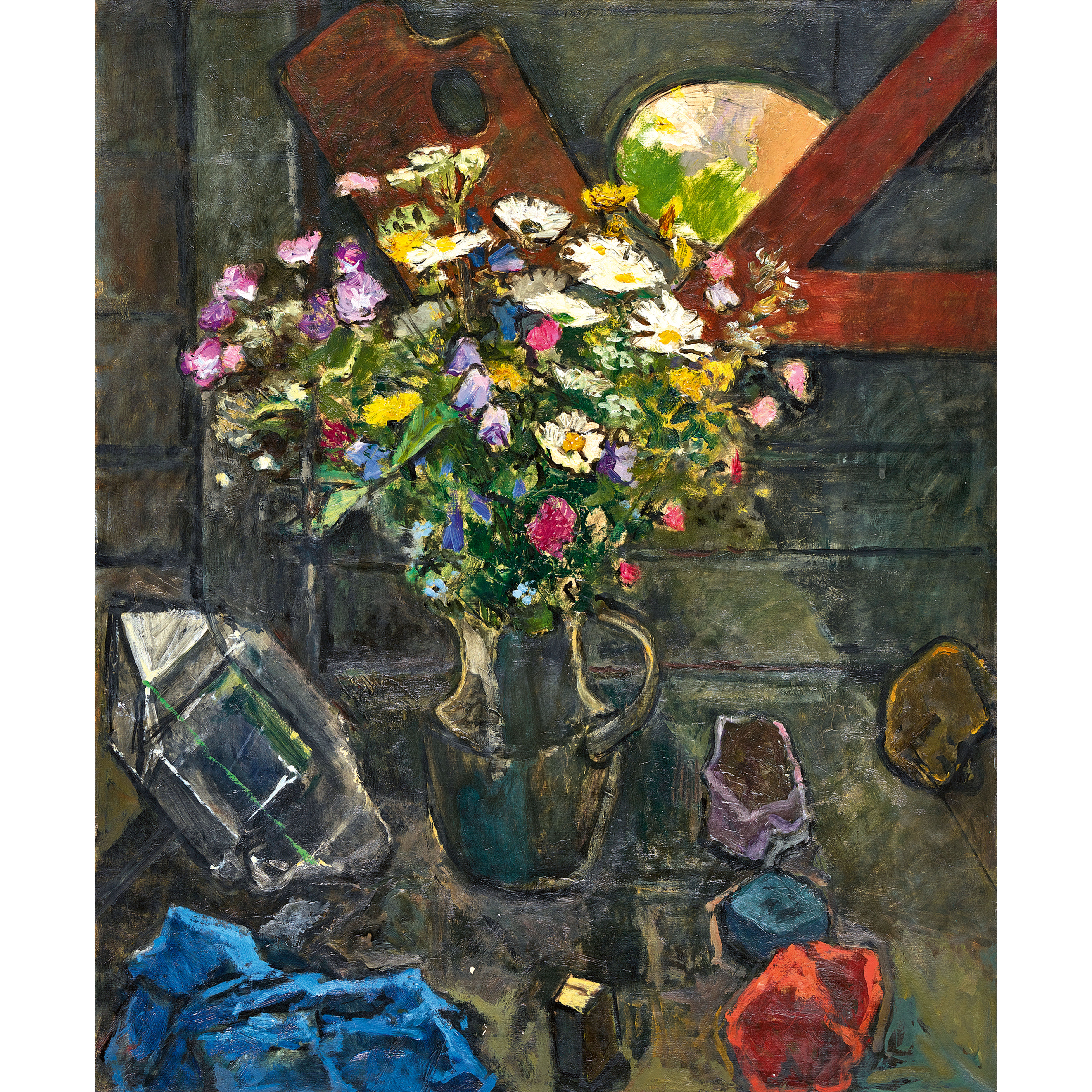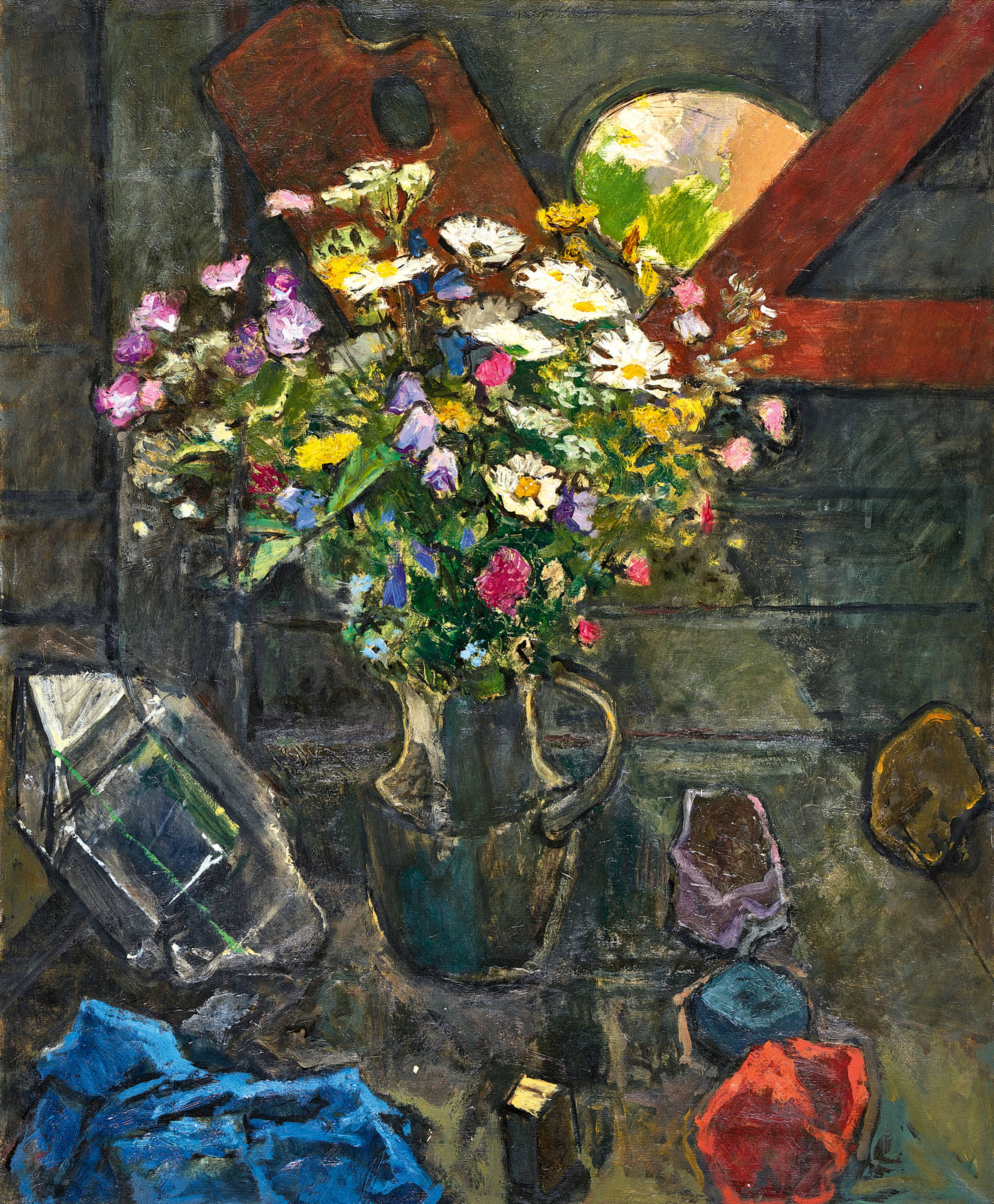 Stillleben mit Malerpalette und Wiesenblumen im Krug.