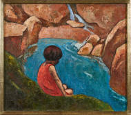 Mädchen in rotem Kleid am Bergbach.