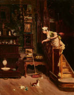 Dienstmagd beim Spiel mit Kätzchen.