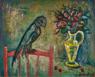 "Perroquet sur chaise rose".
