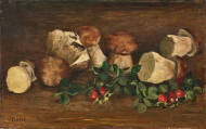 Stillleben mit Steinpilzen und Hagebutten.
