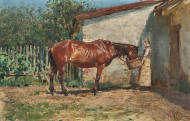 Bauernmagd beim Füttern des Pferdes.