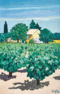 Mediterranes Landgut mit Rebstöcken.
