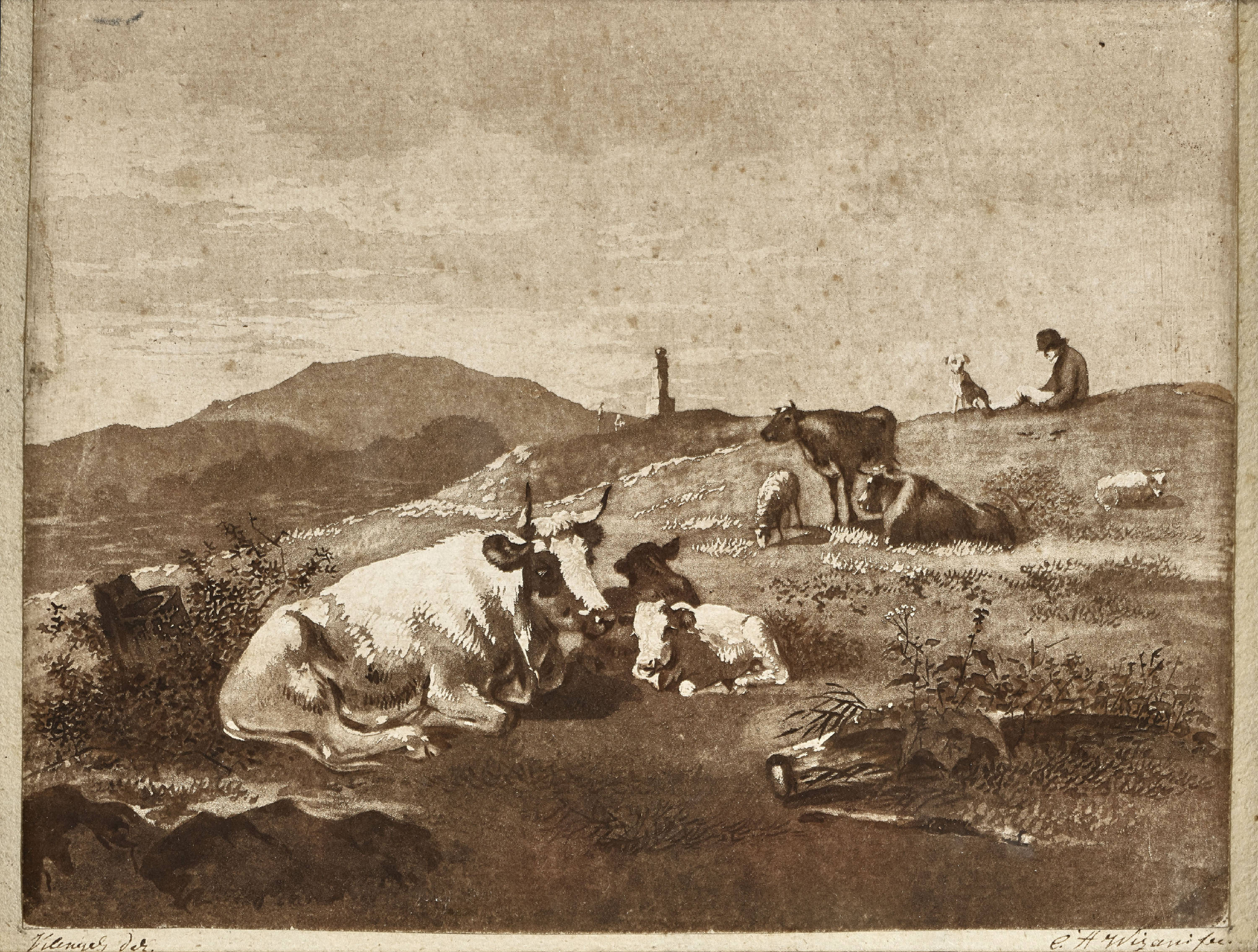 Landschaft mit Kühen, Schafen, Hirte und Hund.