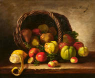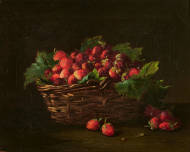 Stillleben mit Erdbeeren in Weidenkörbchen.
