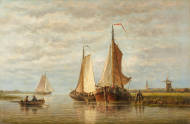 Niederländische Kanallandschaft mit Fischern in Segelbooten.