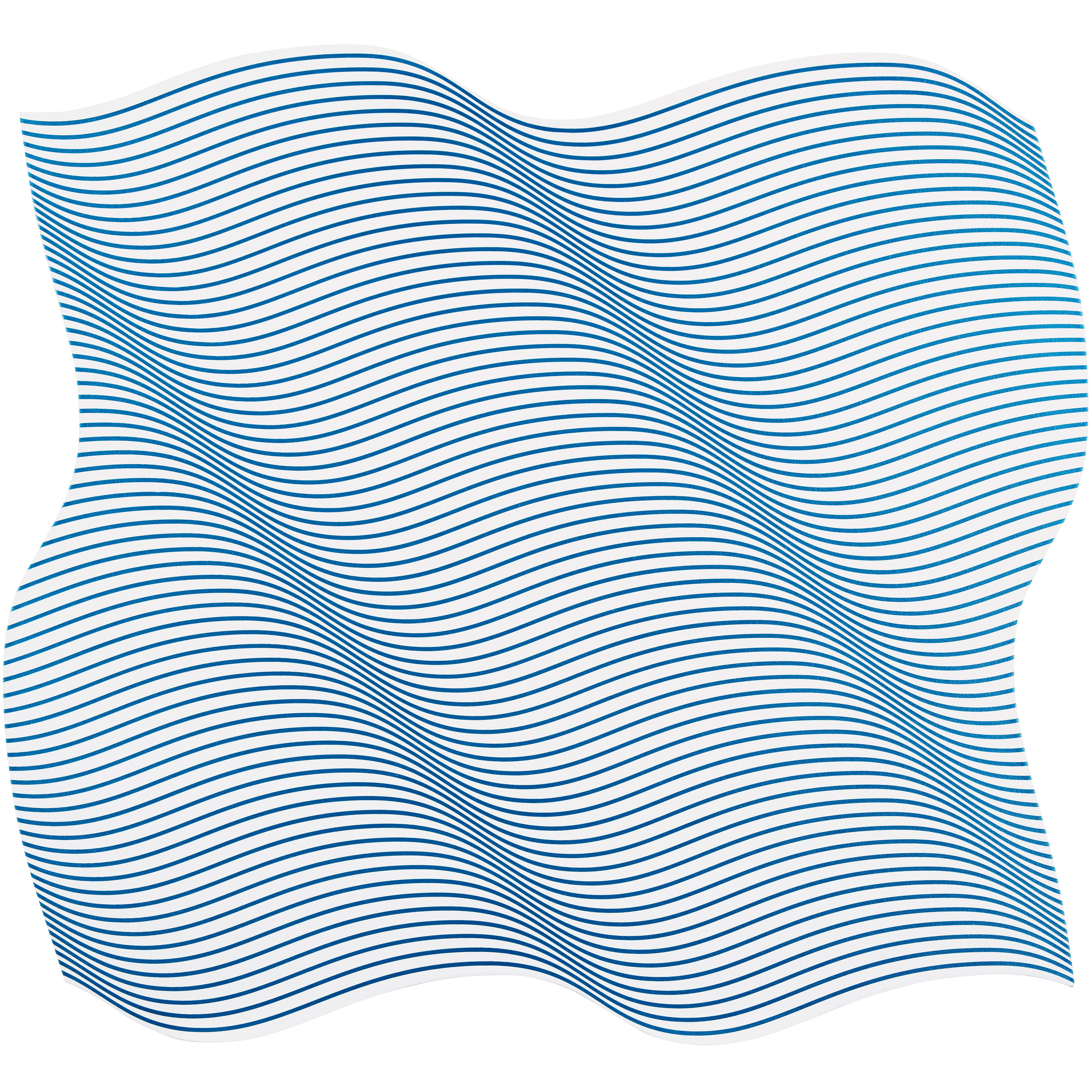 Im vorliegenden Werk "Flag Wave" erzeugen die optisch in präziser Parallele gesetzten Linien eine fliessend-rhythmische Bewegung, die die Komposition dreidimensional erscheinen lässt. Die blaue Farbgebung der Linien weckt zugleich Assoziationen an Wasser und Wellen, und die Silhouette des Bildträgers an eine vom Wind bewegte Flagge.