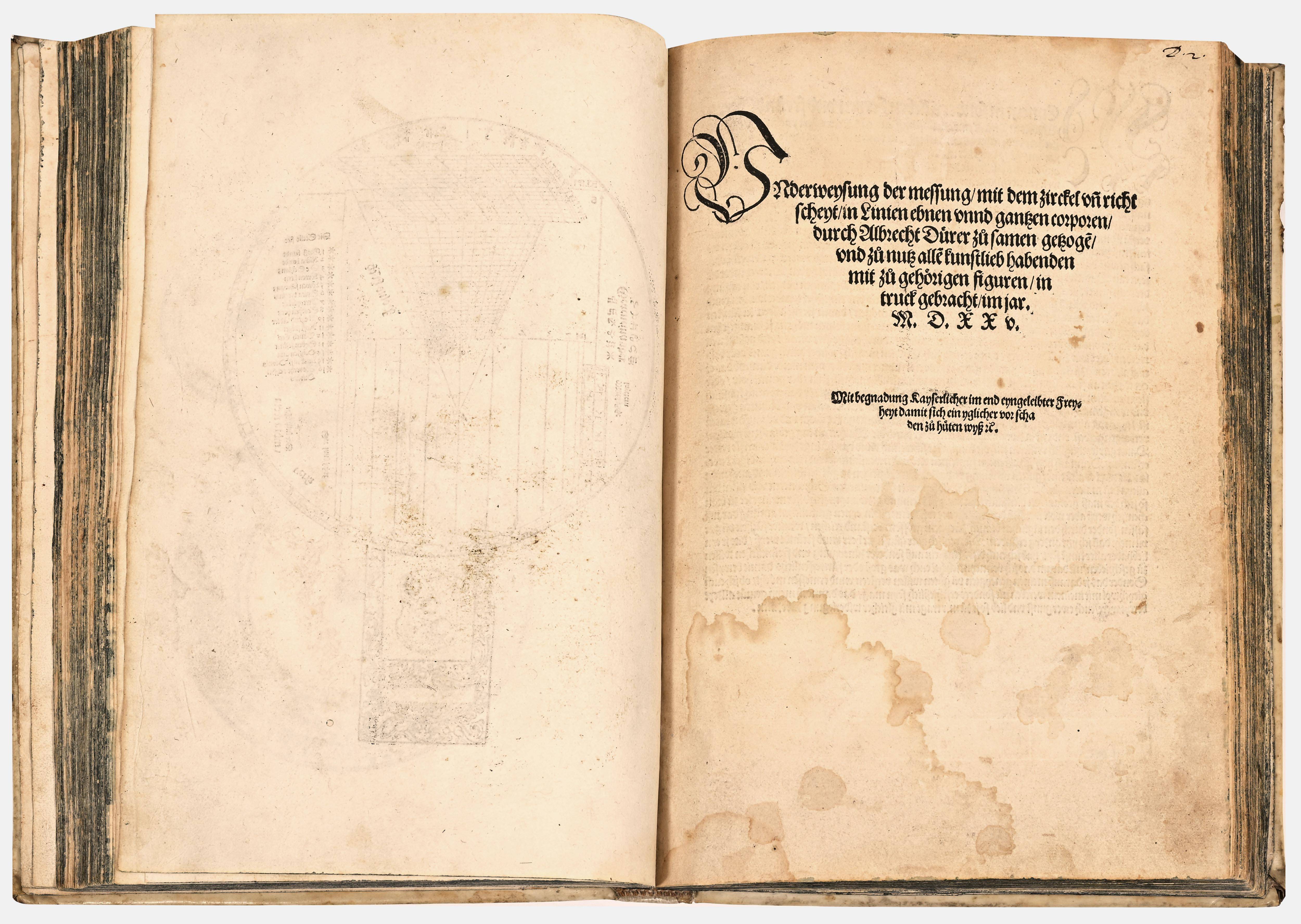 "Underweysung der Messung, mit dem zirckel und richtscheyt, in Linien ebnen unnd gantzen corporen, durch Albrecht Duerer zu samen getzogen, und zu nutz allen kunstlieb habenden mit zu gehörigen figuren, in truck gebracht, im jar M.D.XXv.".