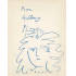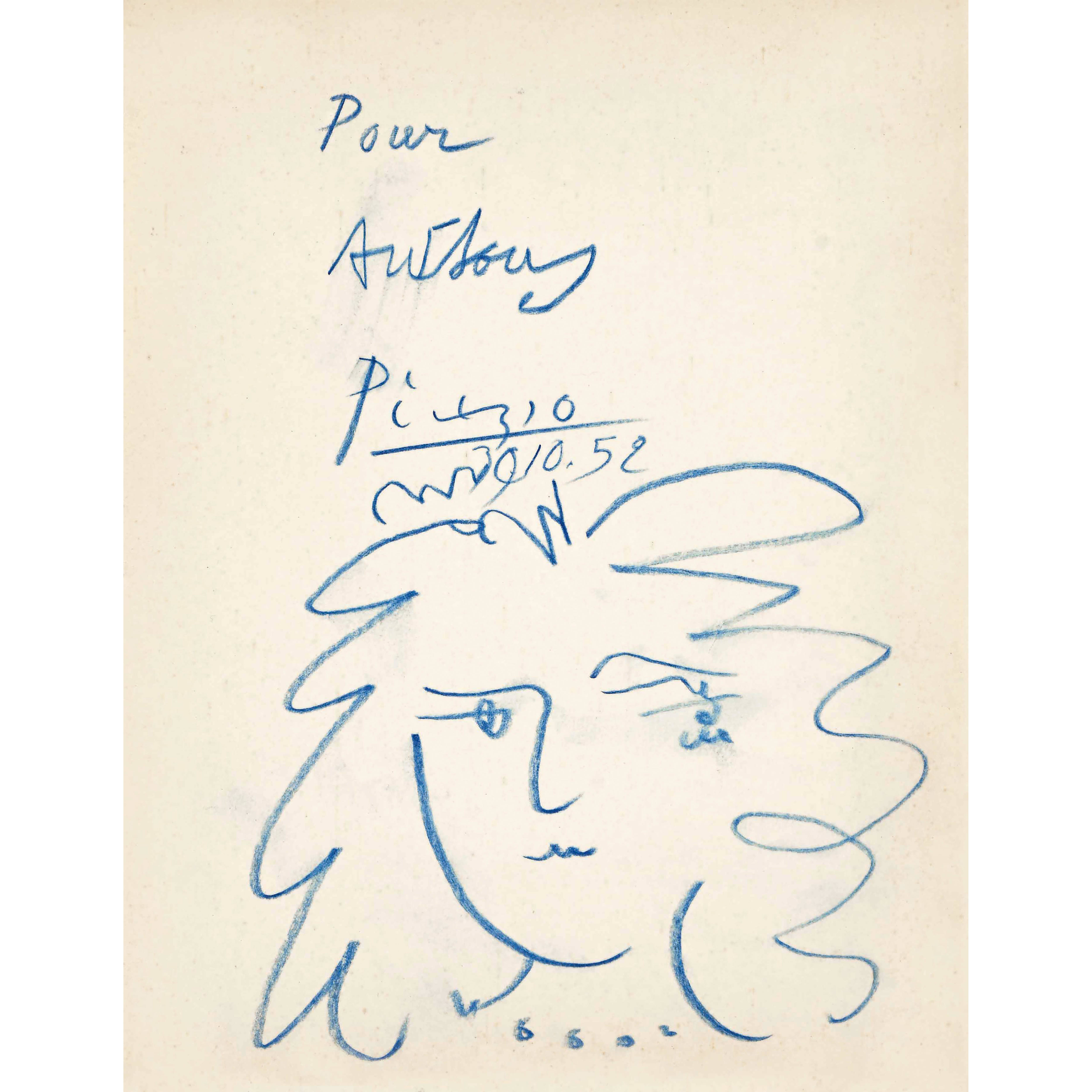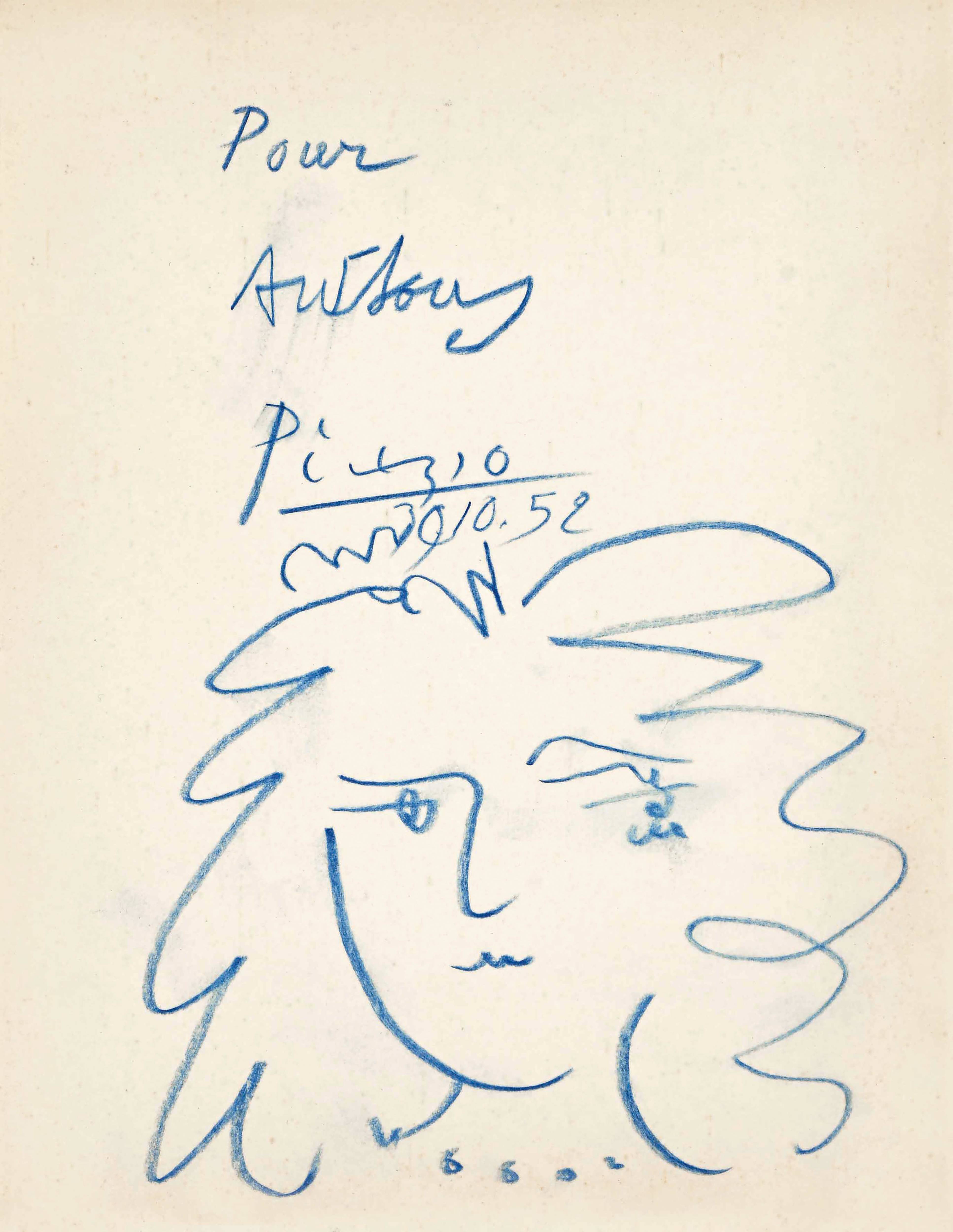 Souillac, Mulhouse 1952. Nr. XVII, "Picasso". In französischer Sprache. Mit zahlreichen Schwarzweiss-Abbildungen. Titelblatt der Broschur mit einer eigenhändigen Frauenkopf-Zeichnung von Pablo Picasso in blauer Kreide, handsig., gewidmet "Pour Anthony"(?) u. dat. "30.10." (19)52. 56 S. Broschur mit grünem Papierumschlag, 8°