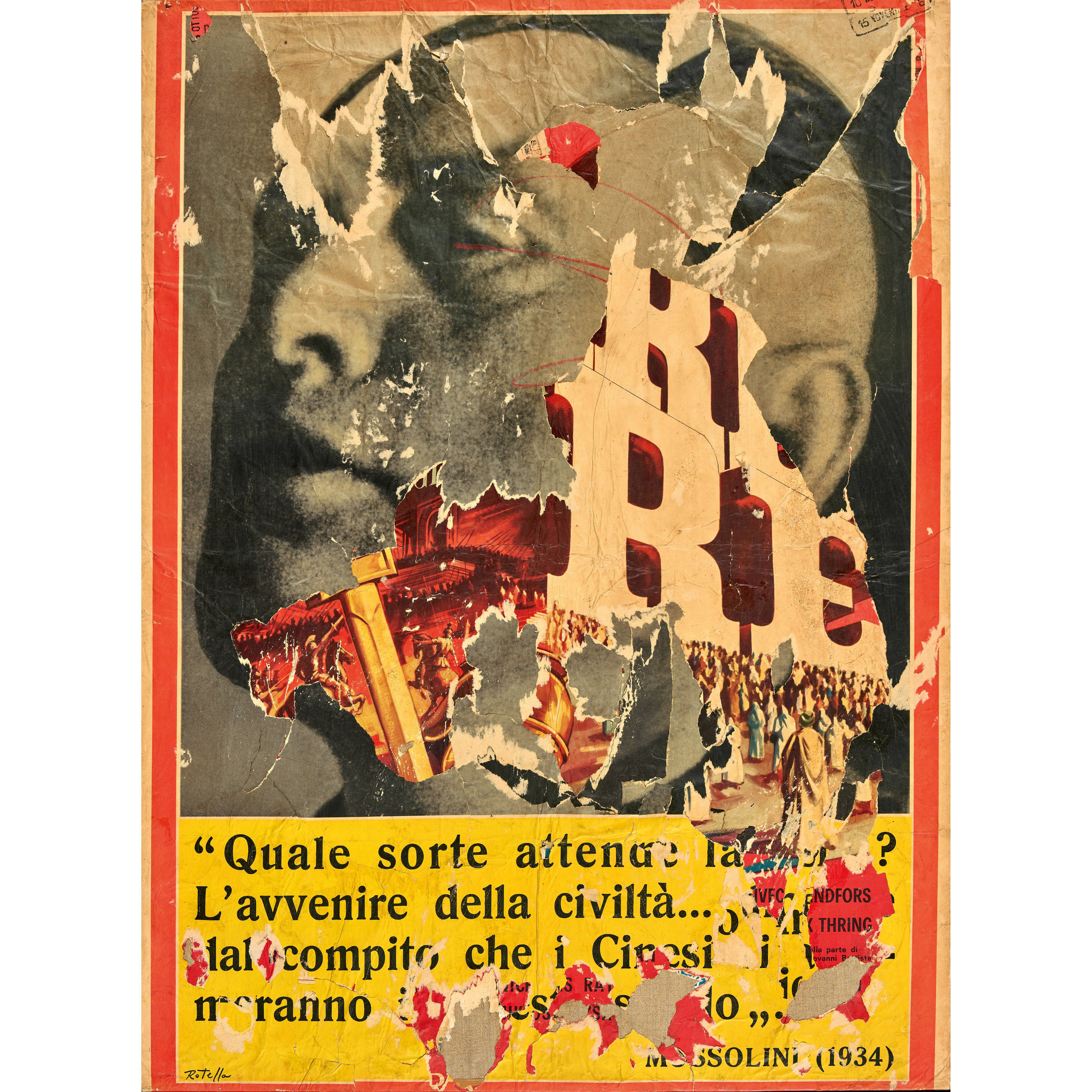 Der Kalabrier Mimmo Rotella war besonders bekannt für seine Décollagen aus zerrissenen Werbeplakaten. Nach dem Studium an der Kunstakademie in Neapel zog der Künstler 1945 nach Rom, wo er sich zunächst der gegenständlichen und abstrakten Malerei sowie der Schöpfung phonetischer Gedichte ("epostaltici") widmete. 1951 erhielt er das Fulbright-Stipendium, das ihm einen längeren Aufenthalt in den Vereinigten Staaten ermöglichte. Dort faszinierten ihn vor allem die Arbeiten des Abstrakten Expressionismus und des Informel. Zurück in Europa, schloss er sich Anfang der 1960er Jahre dem Nouveau Réalisme an, durch welchen er den ästhetischen Reiz abgerissener Plakate entdeckte. Rotellas Werke entstanden aus frei verfügbarem Material der urbanen Nahumgebung, das mittels Kleben, Abreissen und Übermalen verfremdet wurde. Mit seinen abstrakt-figurativen Décollagen nahm der Künstler eine europäische Gegenposition zur amerikanischen Pop Art ein, die sich der konzeptuellen Appropriation Art zuordnen lässt. Parallel dazu beschäftigte sich der Italiener zeitlebens mit phonetischen Gedichten.