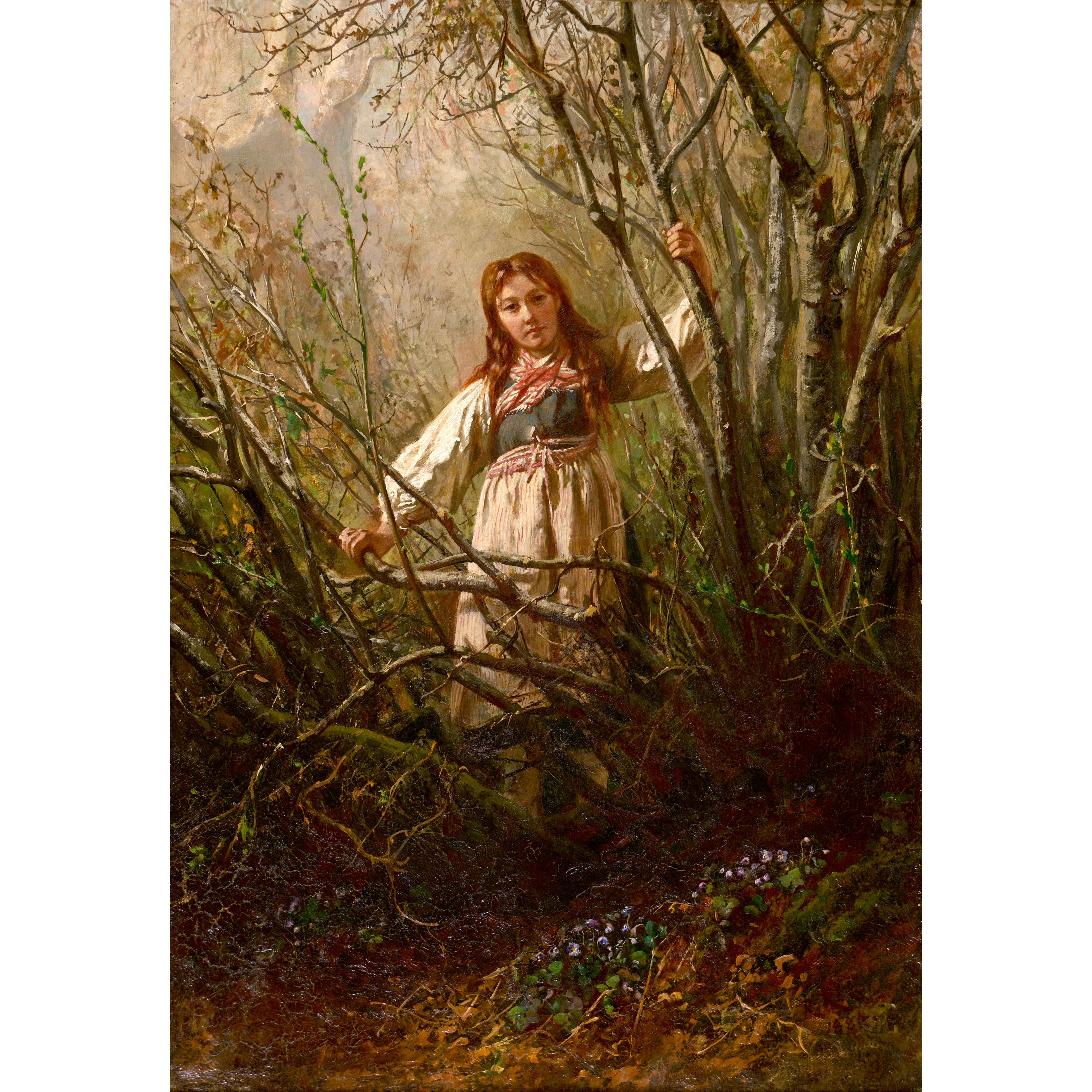 Zart fällt das Licht auf die dunklen Äste des verworrenen Unterholzes. Erste saftiggrüne Triebe und kleine Lederblümchen auf dem mit Laub bedeckten Boden zeigen sich als Vorboten des Frühlings. Mitten in dieser Landschaft steht ein junges Mädchen, das sich an den dünnen Stämmen des Gehölzes festhält, ihren Kopf leicht geneigt, die langen Haare über die Schulter fallend, den Betrachter fokussierend. Raphael Ritz' Gemälde besticht durch seine stimmungsvolle Tonalität und die subtile Behandlung des Motives.