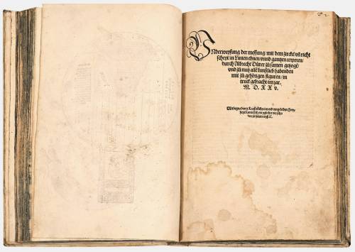 "Underweysung der Messung, mit dem zirckel und richtscheyt, in Linien ebnen unnd gantzen corporen, durch Albrecht Duerer zu samen getzogen, und zu nutz allen kunstlieb habenden mit zu gehörigen figuren, in truck gebracht, im jar M.D.XXv.".