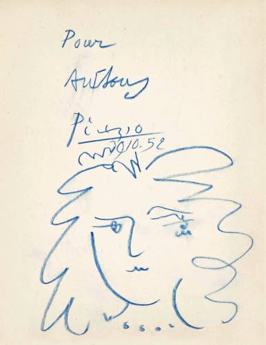 Souillac, Mulhouse 1952. Nr. XVII, "Picasso". In französischer Sprache. Mit zahlreichen Schwarzweiss-Abbildungen. Titelblatt der Broschur mit einer eigenhändigen Frauenkopf-Zeichnung von Pablo Picasso in blauer Kreide, handsig., gewidmet "Pour Anthony"(?) u. dat. "30.10." (19)52. 56 S. Broschur mit grünem Papierumschlag, 8ø