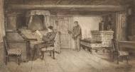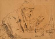 Sitzender Mann mit Pfeife und Glas am Tisch.