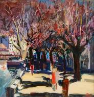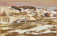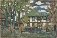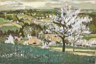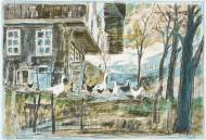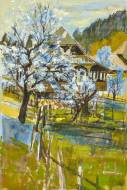 Emmentaler Bauernhaus mit blühenden Obstbäumen.