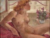 Elegante Dame beim Malen eines Blumenstilllebens.
