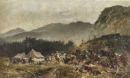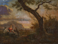 Flussuferpartie mit Reisendem und Reisigsammlerin.