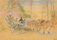 Soldaten mit Pferden am Waldrand.