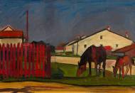 "Chevaux devant une grande ferme".