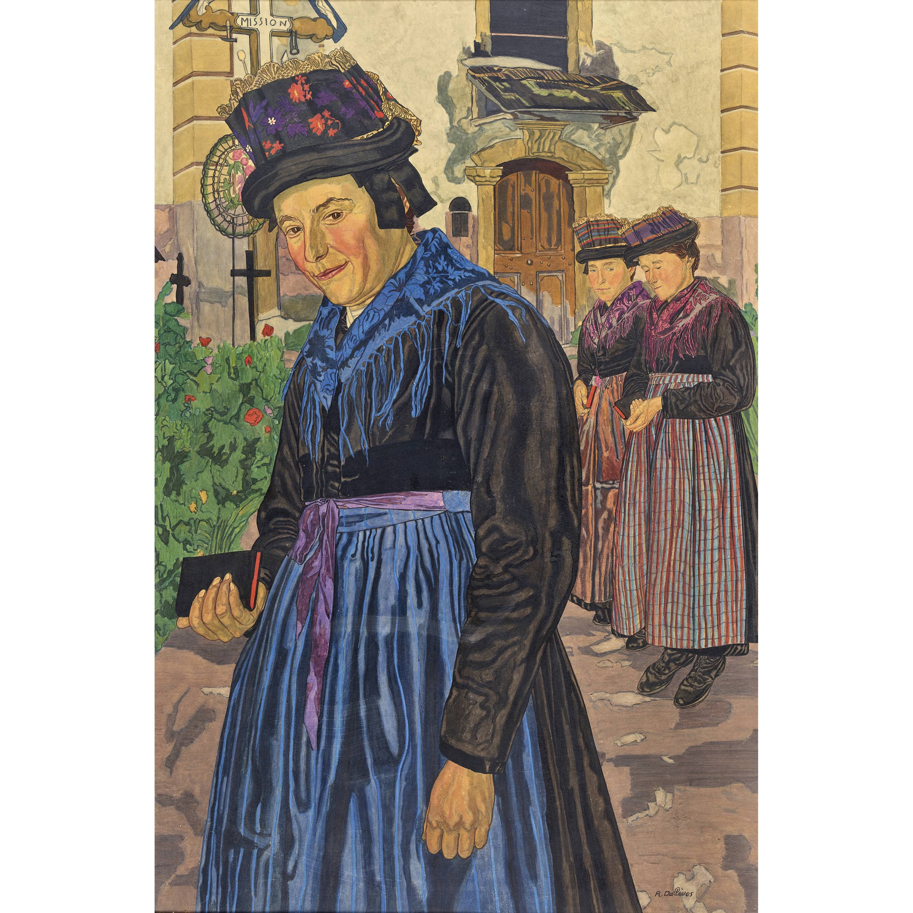 Die vorliegende Arbeit besticht durch ihre sorgfältige Ausarbeitung der drei traditionell gekleideten Walliserinnen beim Verlassen der Kirche von Hérémence. Aus feinen Linien und nuancierten Farbtönen komponierte Dallèves eine Darstellung, die die Bedeutung des christlichen Glaubens in der ländlichen Bevölkerung äusserst feinfühlig erfasste und gleichzeitig stilistische Parallelen zum Werk von Ernest Biéler aufweist. Frédéric Elsig datiert das Werk in die Zeit um 1934 und verweist auf dessen Ähnlichkeit mit dem Gemälde "Pénitent Blanc".