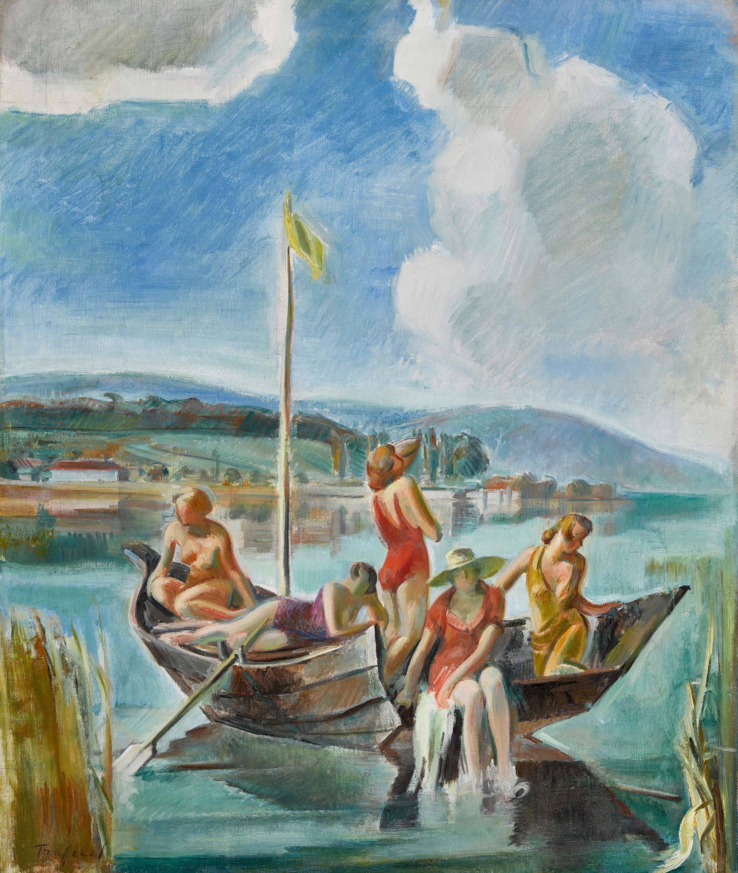 Frauen im Badekostüm auf einem Ruderboot bei der St. Petersinsel.