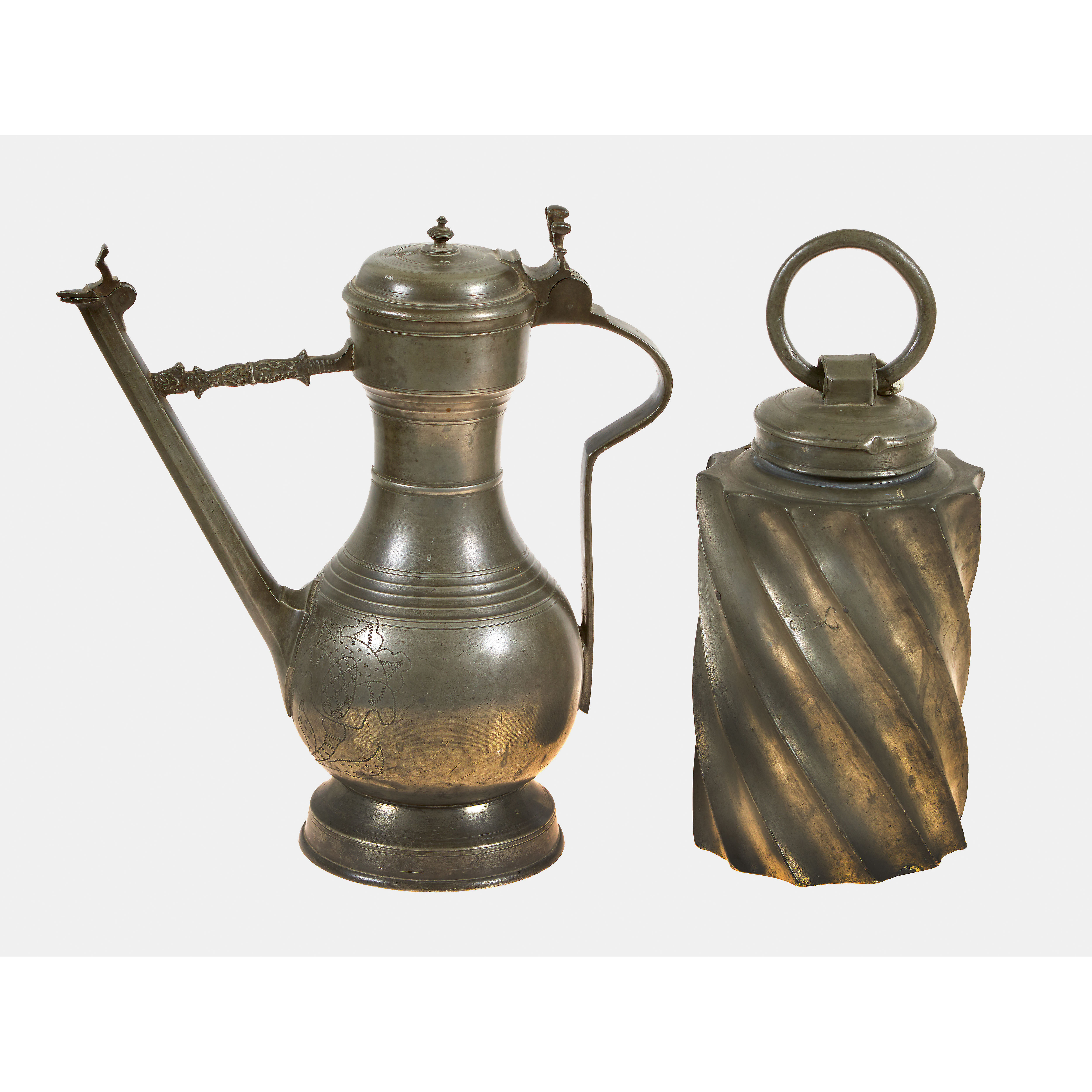 1. Stegkanne mit graviertem Blumendekor. 2. Schraubgefäss mit kannelierter und mit Mgr. versehener Wandung.