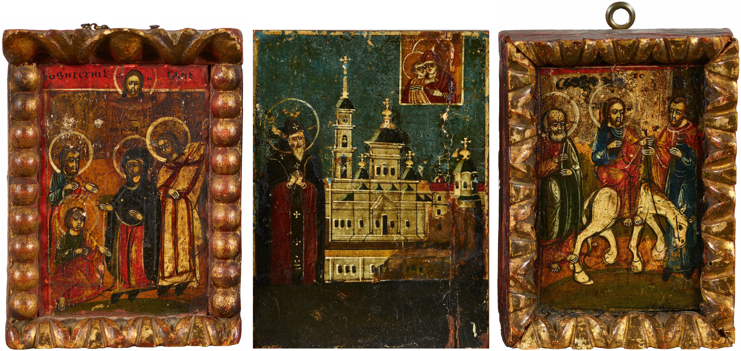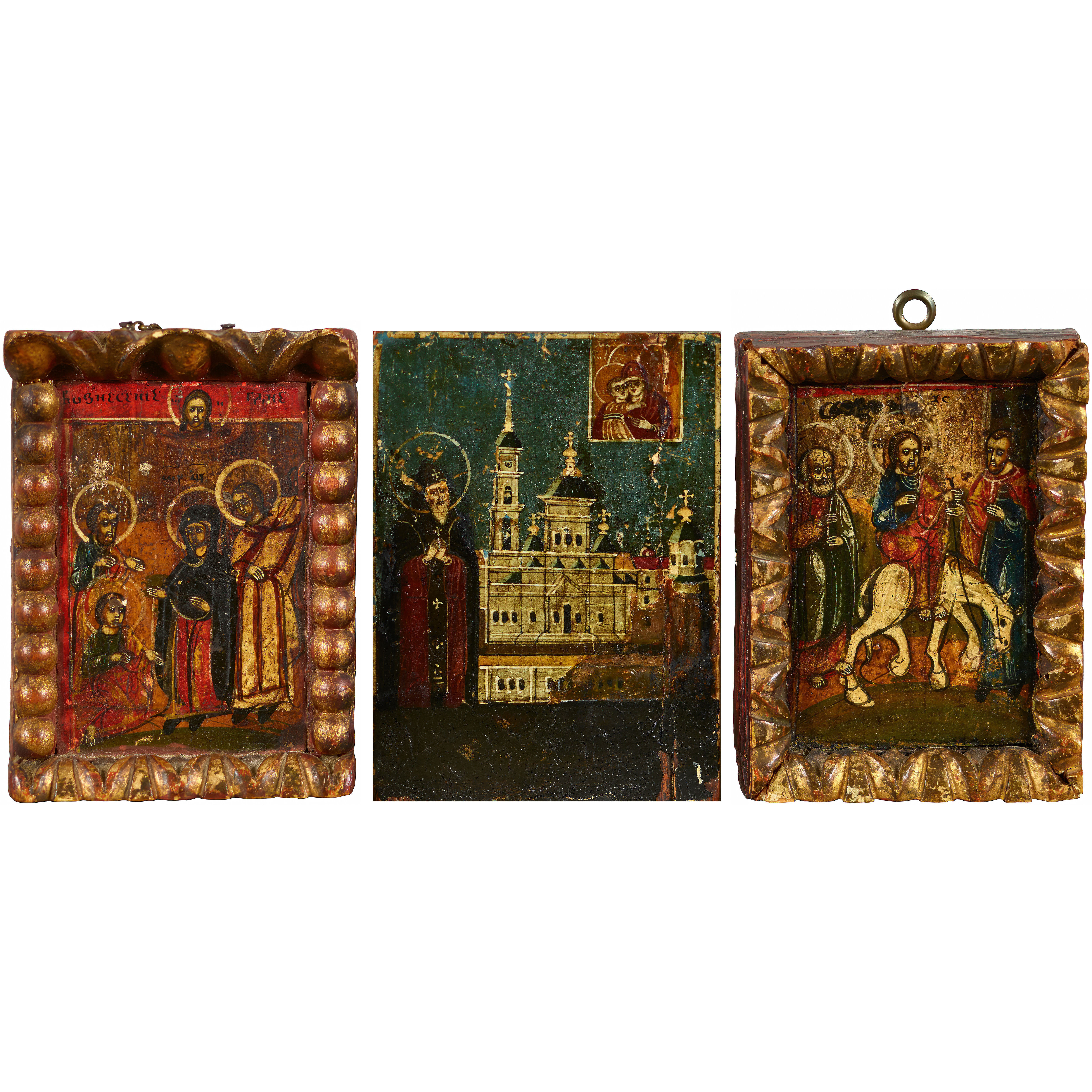 3 Stück. 1. Drei Frauen am leeren Grab Christi, 10,2x7 cm (gerahmt). 2. Christi Einzug nach Jerusalem, 9,5x6,5 cm (gerahmt). 3. Heiliger Sergius von Randonesh (Russland, 19. Jh.), 10,9x8 cm.
